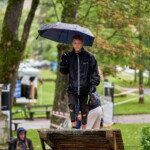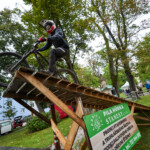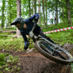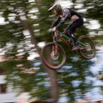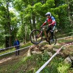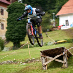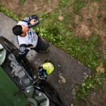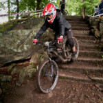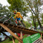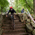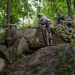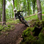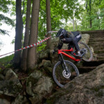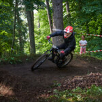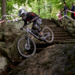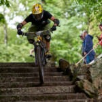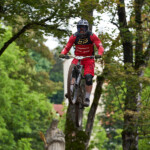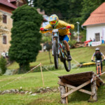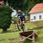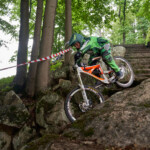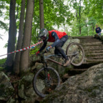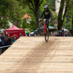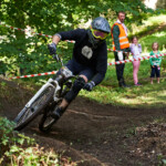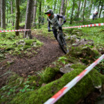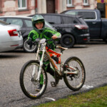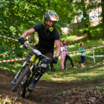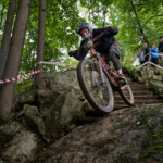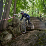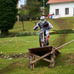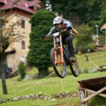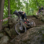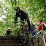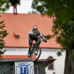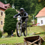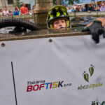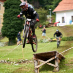 Jak celé dopoledne pršelo a byly posunuté tréninky a následně start závodu, přišlo mi, že se všechno neskutečně zrychlilo. Starty i jízdy závodníků.. Začátek je na kopci u rozhledny. Hned první zatáčku tady berou borci přes nohu. Jak je tady ale to kluzký bahno, tak se jich stejně dost vyválí po zemi. Směrem k cíli se kvalita povrchu zlepšuje a bahno ustupuje. Další pád, který jsem viděl byl na schodech u památníku. Tady to vzal závodník přes řidítka. Normálně se ale zvednul a odjel.