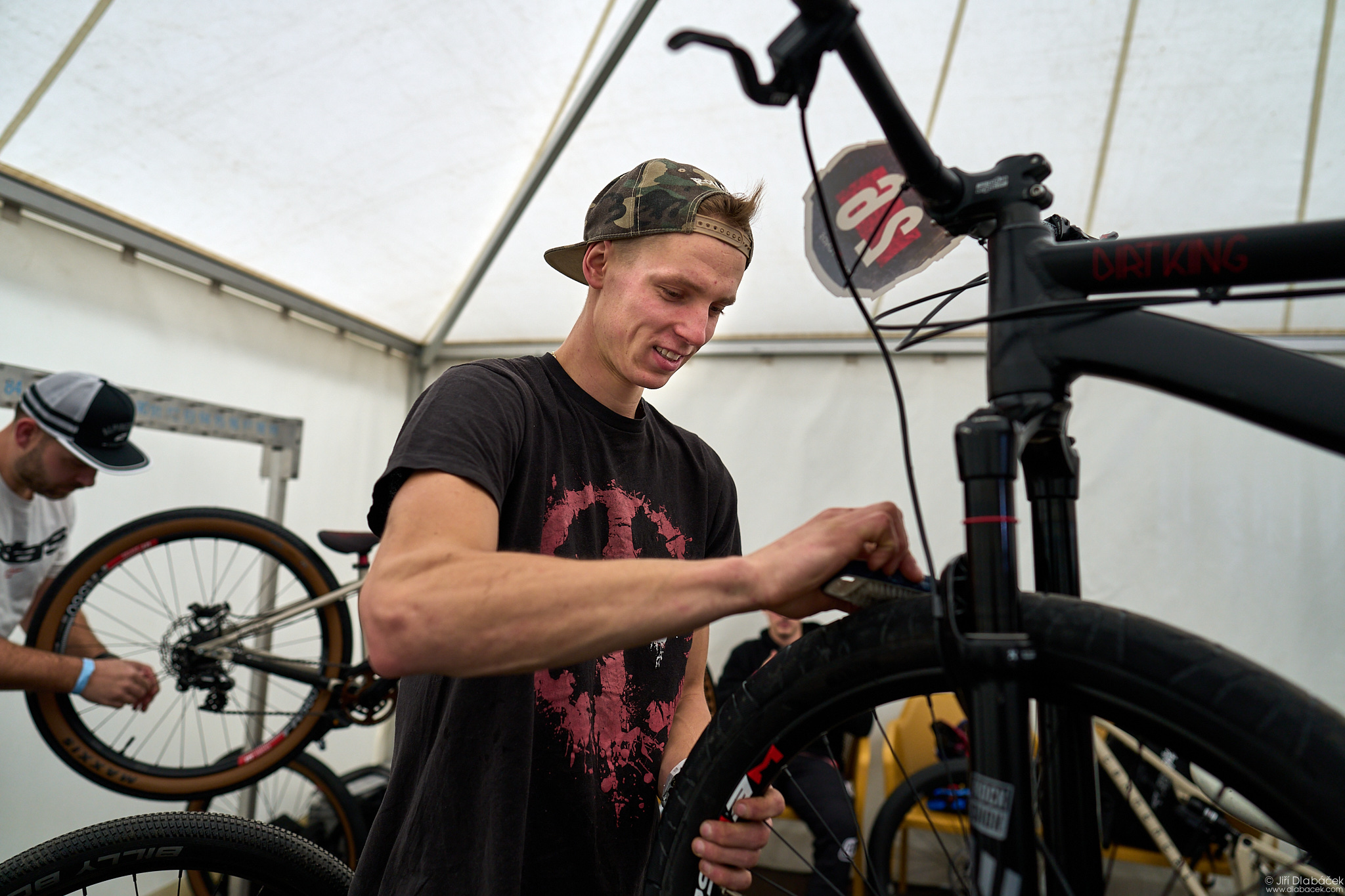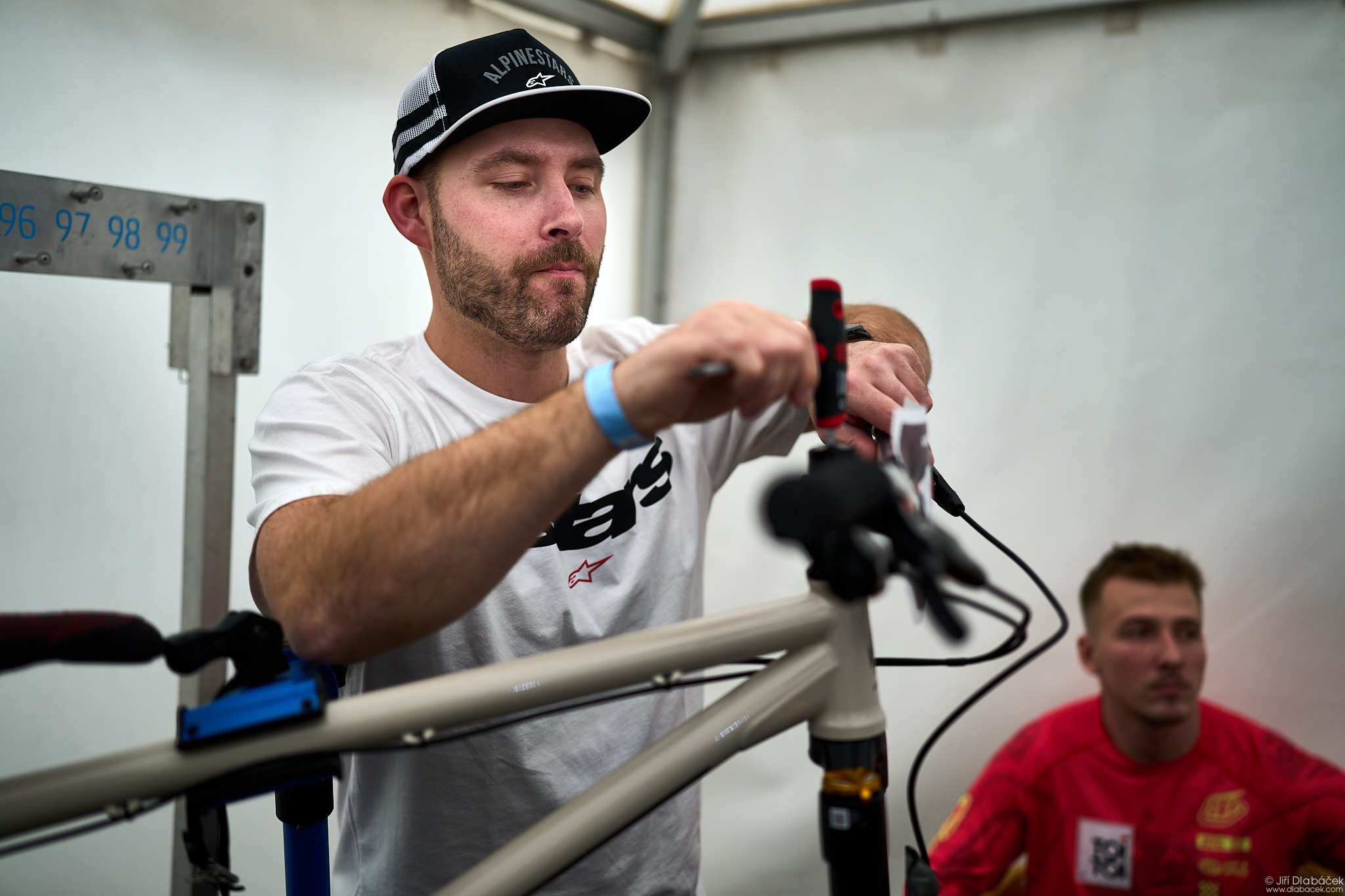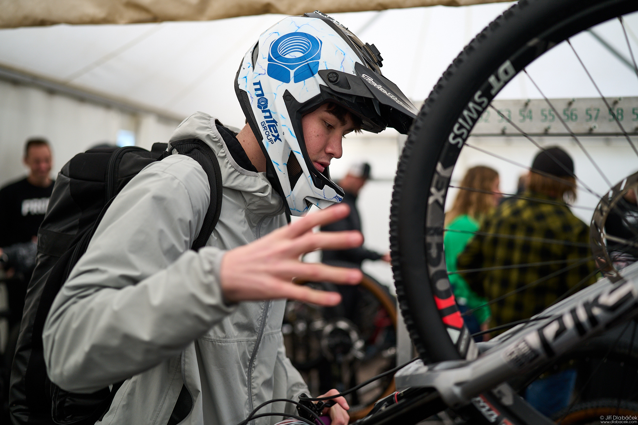 Jezdci a občas někteří s pomocí svých techniků tady ladili své biky. Zásadní bylo nastříkat pláště lepivou vrstvou, aby mělo kolo na naleštěných dlaždicích vůbec nějakou adhezi. Po riders meetingu začaly první tréninky. První půlhodinu vyhradili pořadatelé pro slopestyle. Potom, až do začátku závodu v jednu hodinu, byli na řadě závodníci ve sjezdu.
