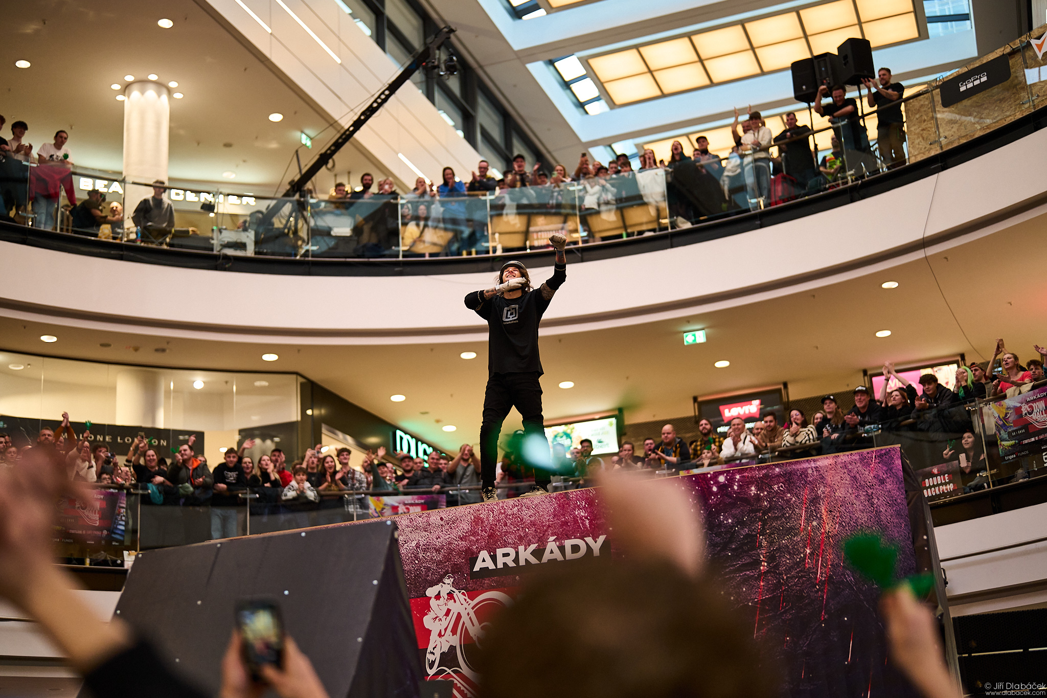 Rideři startovali přímo před obřím akváriem ve Světě medúz, které je umístěno na střeše obchodního centra Arkády na Pankráci. Následoval průjezd venkovní pasáží a potom velký drop do nákupní galerie. Hned za ním velký skok, následovaný menším, který zavedl závodníky do uliček obchodního centra. Po sjetí dvou eskalátorů byl závěrečný velký skok a dopad do cíle. Oba závody se jely na dvě jízdy a závěrečné finále. Ve sjezdu postupovalo do dalšího kola jenom několik prvních jezdců. Jak to bylo ve slope stylu, nevím.