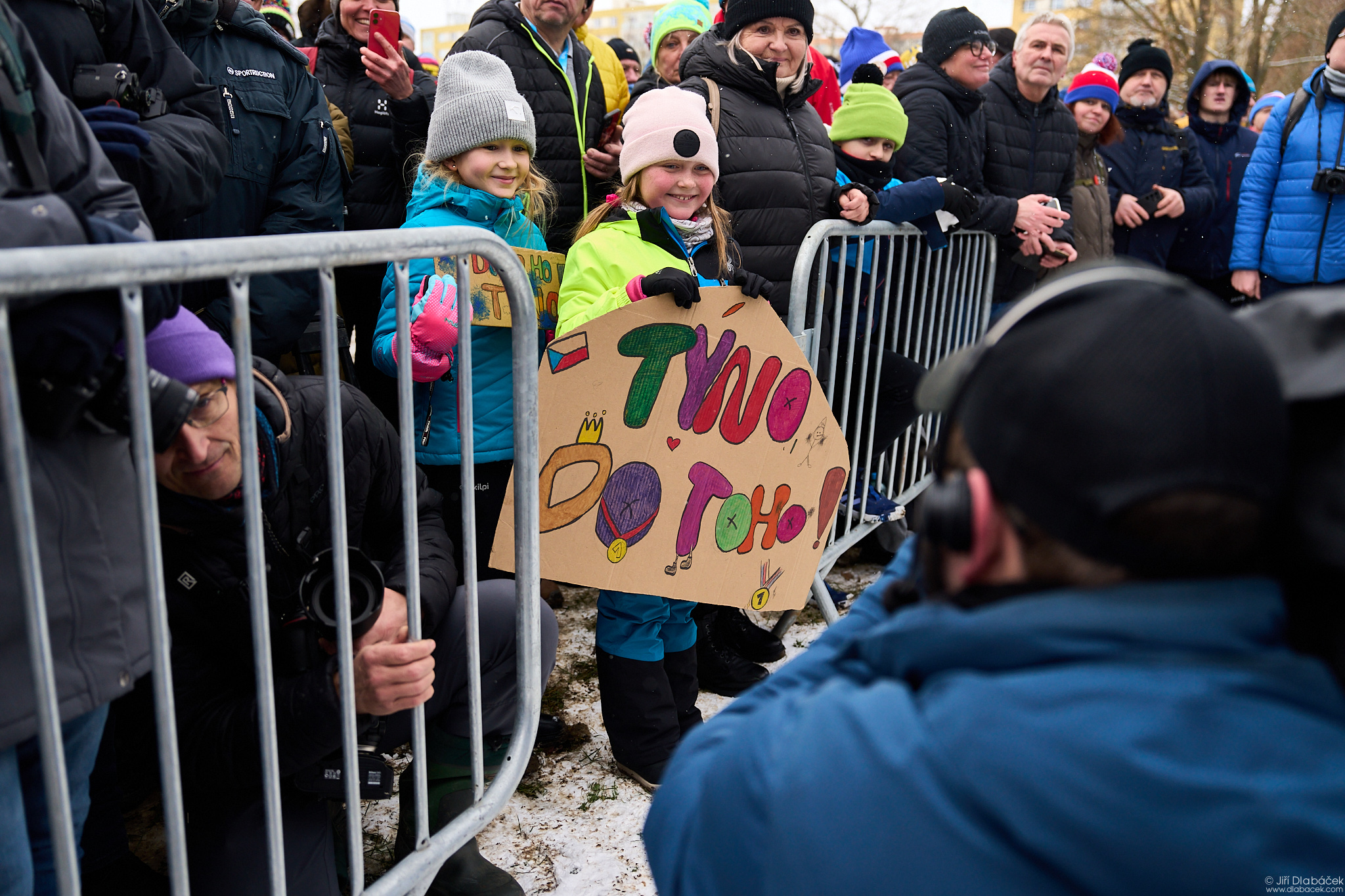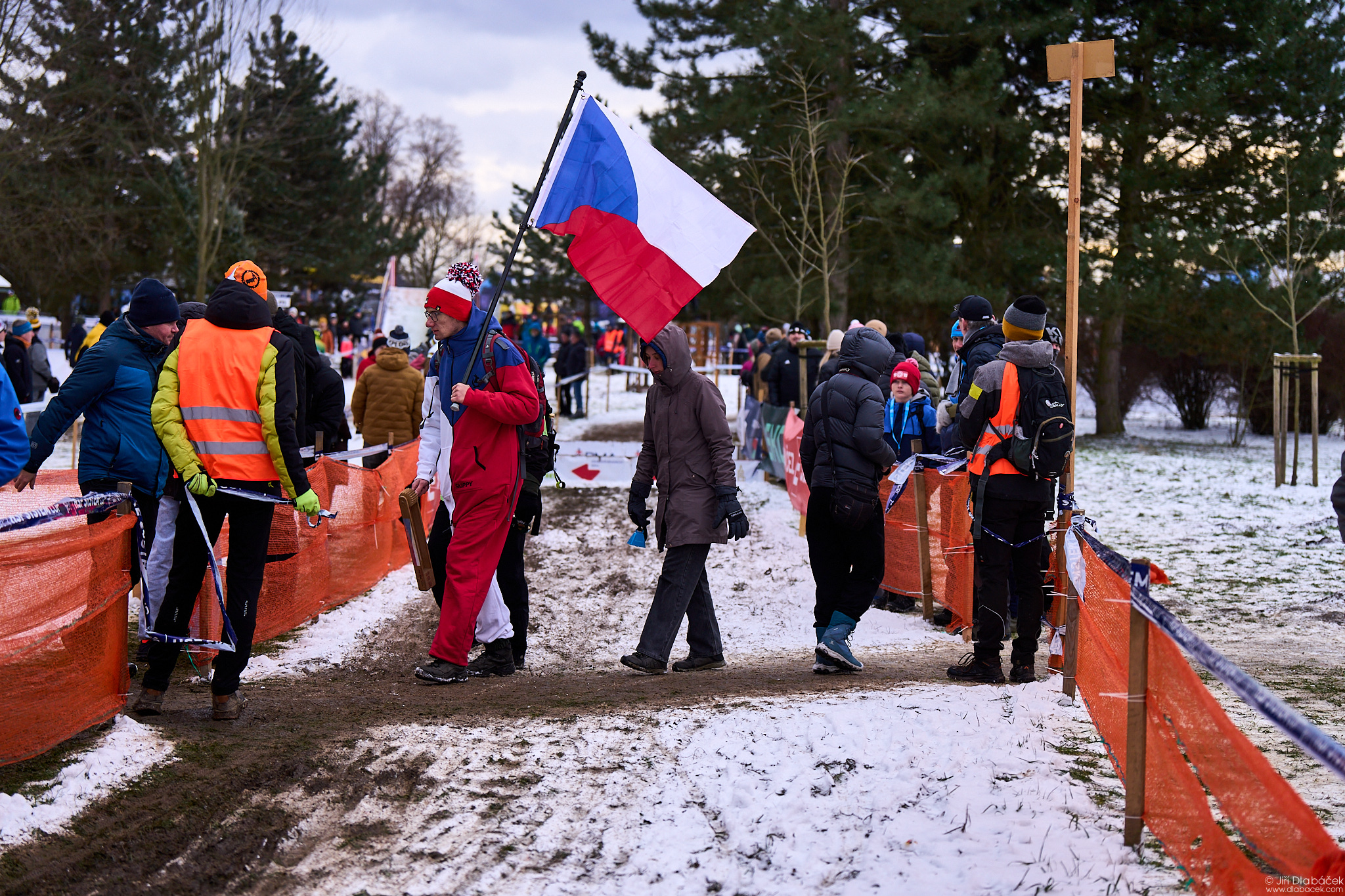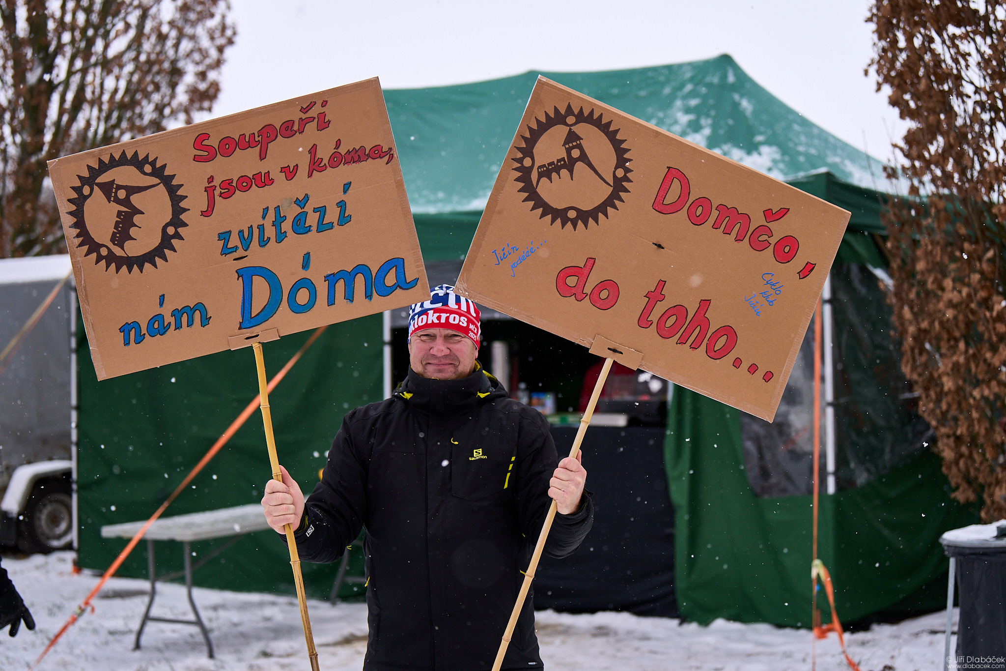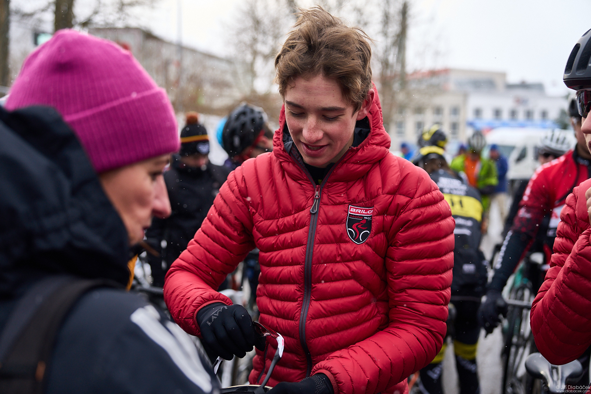 První startovala kategorie juniorů. Asi nikoho nepřekvapilo, že ji vyhrál Kryštof Bažant. Po odjetí prvního kategorie jsem si všimnul celého zájezdu fanoušků Emila Hekeleho. Zachránili mě od zmrznutí čajem se slivovicí. Já jsem jim na oplátku udělal pár společných fotek. Je ale čas se přemístit ke startu, kde budou za chvíli startovat další kategorie závodníků, nebo spíš závodnic.