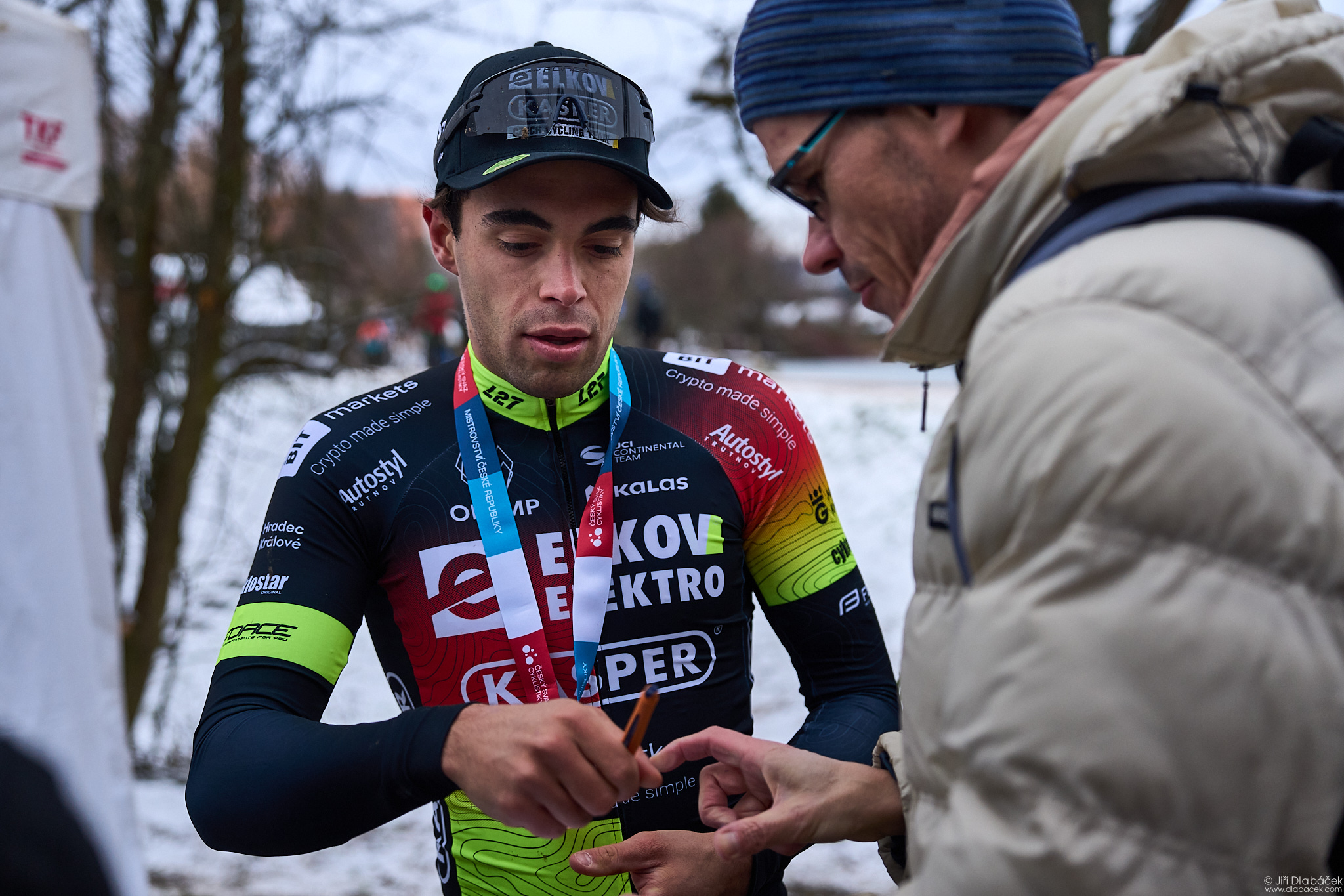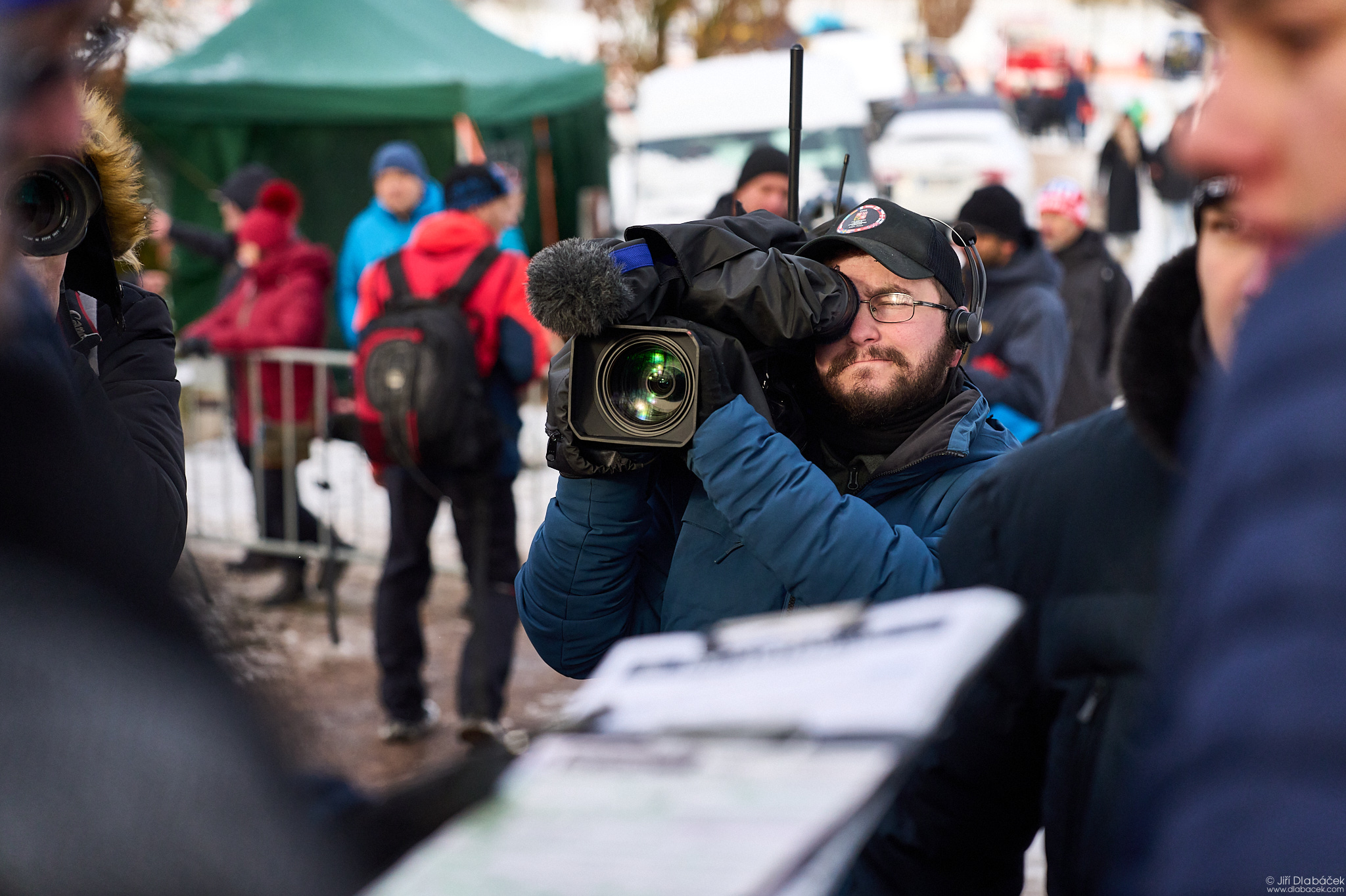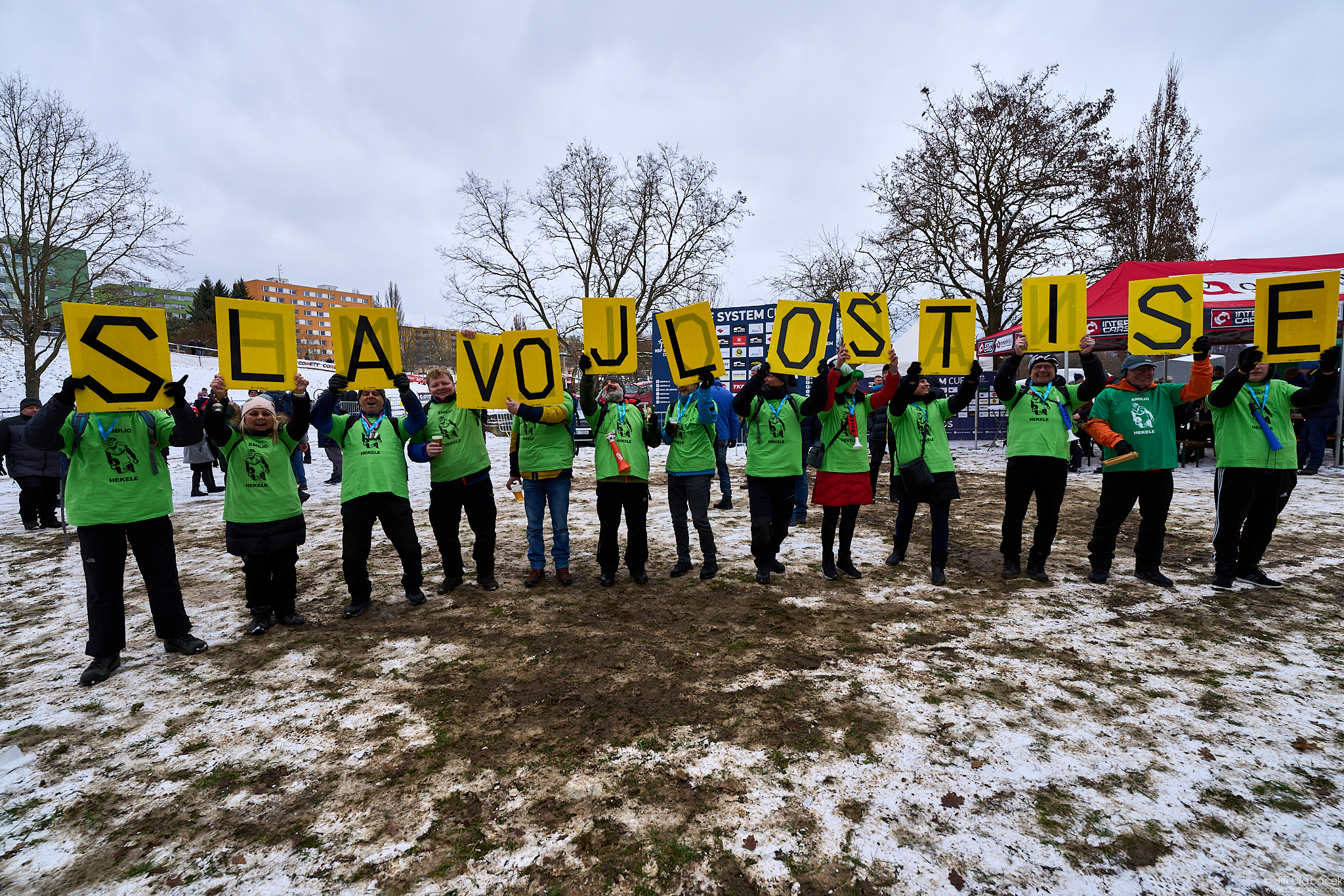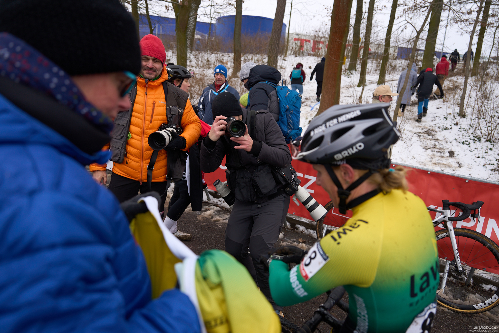 První startovala kategorie juniorů. Asi nikoho nepřekvapilo, že ji vyhrál Kryštof Bažant. Po odjetí prvního kategorie jsem si všimnul celého zájezdu fanoušků Emila Hekeleho. Zachránili mě od zmrznutí čajem se slivovicí. Já jsem jim na oplátku udělal pár společných fotek. Je ale čas se přemístit ke startu, kde budou za chvíli startovat další kategorie závodníků, nebo spíš závodnic.
